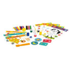 O kit contém: 12 massinhas coloridas, 06 tintas guache, 01 pincel, 01 carretilha, 01 espátula, 01 pinça de plástico, 16 cartões com exercícios, 02 jogos em madeira e 01 manual ilustrado explicando cada atividade e as habilidades que elas desenvolvem.